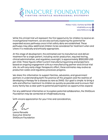 Fundada por Leena Panwala e Akshay Panwala, depois que sua filha Ariya foi diagnosticada e eles descobriram que não havia tratamento ou pesquisas em andamento para isso. Desde então, a fundação tem trabalhado continuamente para encontrar um tratamento eficaz e, pela primeira vez na história, teremos finalmente um medicamento com grande potencial. Visite o site da INADcure: www.inadcure.org