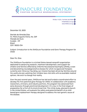 Existe uma única esperança para que o sorriso do Yuri não se perca e ele possa viver e não sofrer mais. Descobrimos uma ONG nos Estados Unidos chamada INADcure Foundation, que nos últimos 10 anos tem financiado estudos para uma terapia gênica, único tratamento capaz de frear a doença. Nesse ano de 2025 eles finalmente estão próximos da fase de testes clínicos em humanos para poder ter o medicamento aprovado pela FDA.